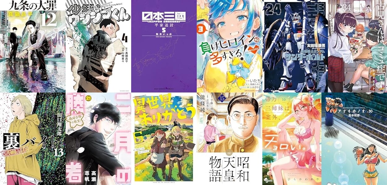 「九条の大罪」「少年院ウシジマくん」「日本三國」「負けヒロインが多すぎる!」「機動戦士ガンダム サンダーボルト」「裏バイト:逃亡禁止」「二月の勝者」「異世界ありがとう」「昭和天皇物語」「古見さんは、コミュ症です。」「帝乃三姉妹は案外、チョロい。」「アオイホノオ」「あおざくら 防衛大学校物語」などなど。