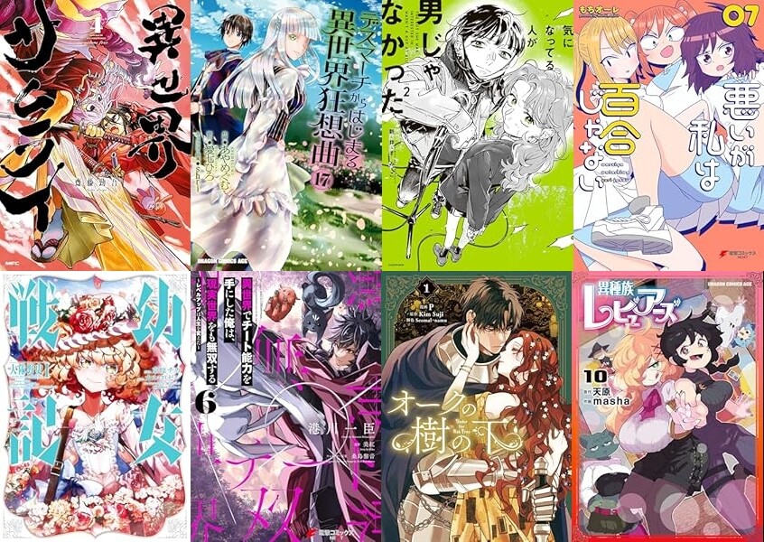 「異世界サムライ」「デスマーチからはじまる異世界狂想曲」「気になってる人が男じゃなかった」「悪いが私は百合じゃない」「幼女戦記 大隊野史~Another Story of the Battalion~」「異世界でチート能力を手にした俺は、現実世界をも無双する」「オークの樹の下」「異種族レビュアーズ」「異世界のすみっこで快適ものづくり生活」「夜行堂奇譚」「平民出身の帝国将官、無能な貴族上官を蹂躙して成り上がる」などなど。