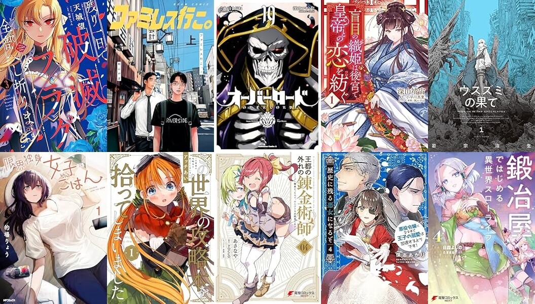 「残り一日で破滅フラグ全部へし折ります」「ファミレス行こ。」「オーバーロード」「盲目の織姫は後宮で皇帝との恋を紡ぐ」「ウスズミの果て」「限界独身女子(26)ごはん」「わたしが誰だかわかりましたか?」「この世界の攻略本を拾ってしまいました」「王都の外れの錬金術師」「歴史に残る悪女になるぞ」「鍛冶屋ではじめる異世界スローライフ」「かわいすぎる人よ!」などなど。