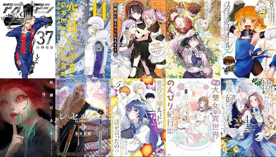 小学館「アオアシ(37)」「空母いぶきGREAT GAME(14)」「太陽と月の鋼(9)」「レ・セルバン(5)」「ROPPEN-六篇-(6)」「フールナイト(9)」など、KADOKAWA「歴史に残る悪女になるぞ 悪役令嬢になるほど王子の溺愛は加速するようです! 5」「悪役令嬢ルートがないなんて、誰が言ったの? 5」など発売。