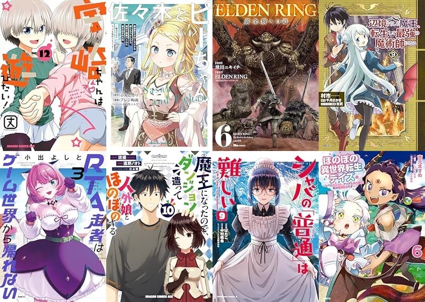 「宇崎ちゃんは遊びたい!」「佐々木とピーちゃん」「ELDEN RING 黄金樹への道」「辺境ぐらしの魔王、転生して最強の魔術師になる」「RTA走者はゲーム世界から帰れない」「魔王になったので、ダンジョン造って人外娘とほのぼのする」「シャバの『普通』は難しい」「ほのぼの異世界転生デイズ」など、35冊以上をまとめました。