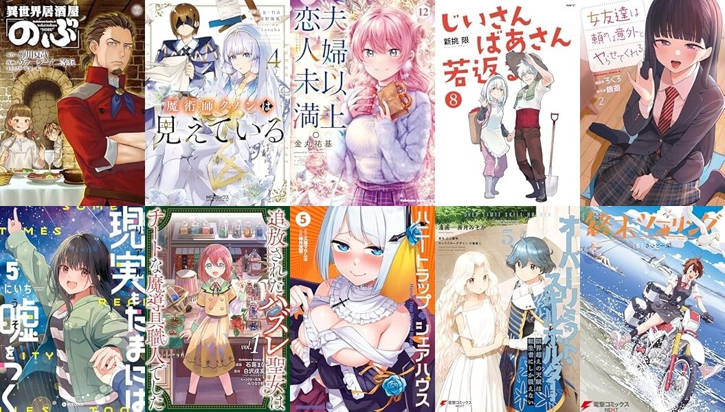 「異世界居酒屋『のぶ』」「魔術師クノンは見えている」「夫婦以上、恋人未満。」「じいさんばあさん若返る」「女友達は頼めば意外とヤらせてくれる」「現実もたまには嘘をつく」「追放されたハズレ聖女はチートな魔導具職人でした」「ハニートラップ・シェアハウス」「貴族から庶民になったので、婚約を解消されました!」「3組の幼なじみ」「ようこそ『追放者ギルド』へ」「文豪ストレイドッグス」など、40冊以上をまとめました。
