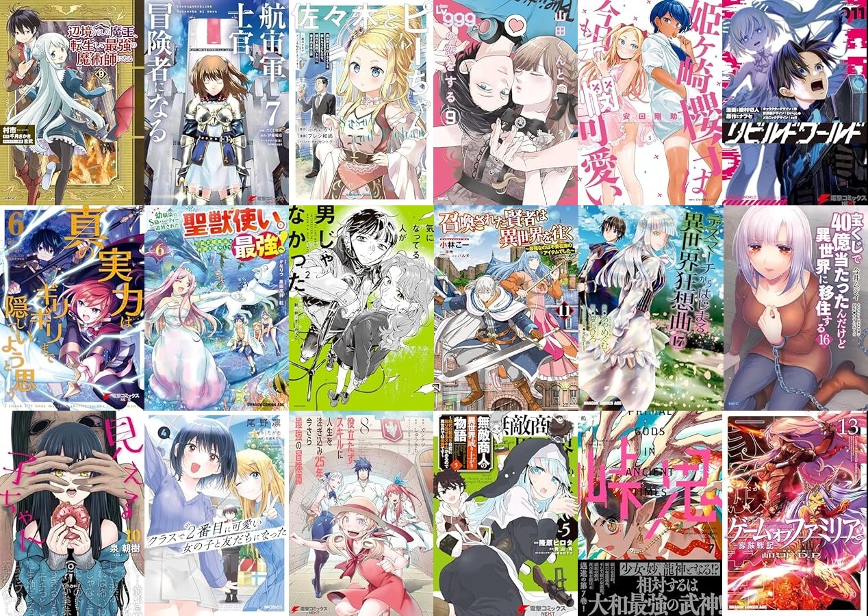 「辺境ぐらしの魔王、転生して最強の魔術師になる」「航宙軍士官、冒険者になる」「佐々木とピーちゃん」「山田くんとLv999の恋をする」「姫ヶ崎櫻子は今日も不憫可愛い」「リビルドワールド」「真の実力はギリギリまで隠していようと思う」「幼馴染のS級パーティーから追放された聖獣使い。万能支援魔法と仲間を増やして最強へ!」「気になってる人が男じゃなかった」「召喚された賢者は異世界を往く」「デスマーチからはじまる異世界狂想曲」「宝くじで40億当たったんだけど異世界に移住する」「見える子ちゃん」「クラスで2番目に可愛い女の子と友だちになった」「役立たずスキルに人生を注ぎ込み25年、今さら最強の冒険」「無敵商人の異世界成り上がり物語」など、30冊以上をまとめました。