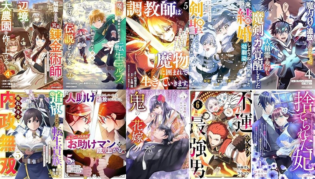 「解雇された宮廷錬金術師は辺境で大農園を作り上げる」「魔術を極めて旅に出た転生エルフ、持て余した寿命で生ける伝説となる」「調教師は魔物に囲まれて生きていきます。」「将来結婚しようね、と約束した幼馴染が剣聖になって帰ってきた」「魔力0で追放されましたが、大精霊と契約し魔剣の力が覚醒しました」「追放された転生貴族、外れスキルで内政無双」「人助けをしたらパーティを追放された男は、ユニークスキル『お助けマン』で成り上がる。」「鬼の花嫁」「捨てられた妃」などなど。