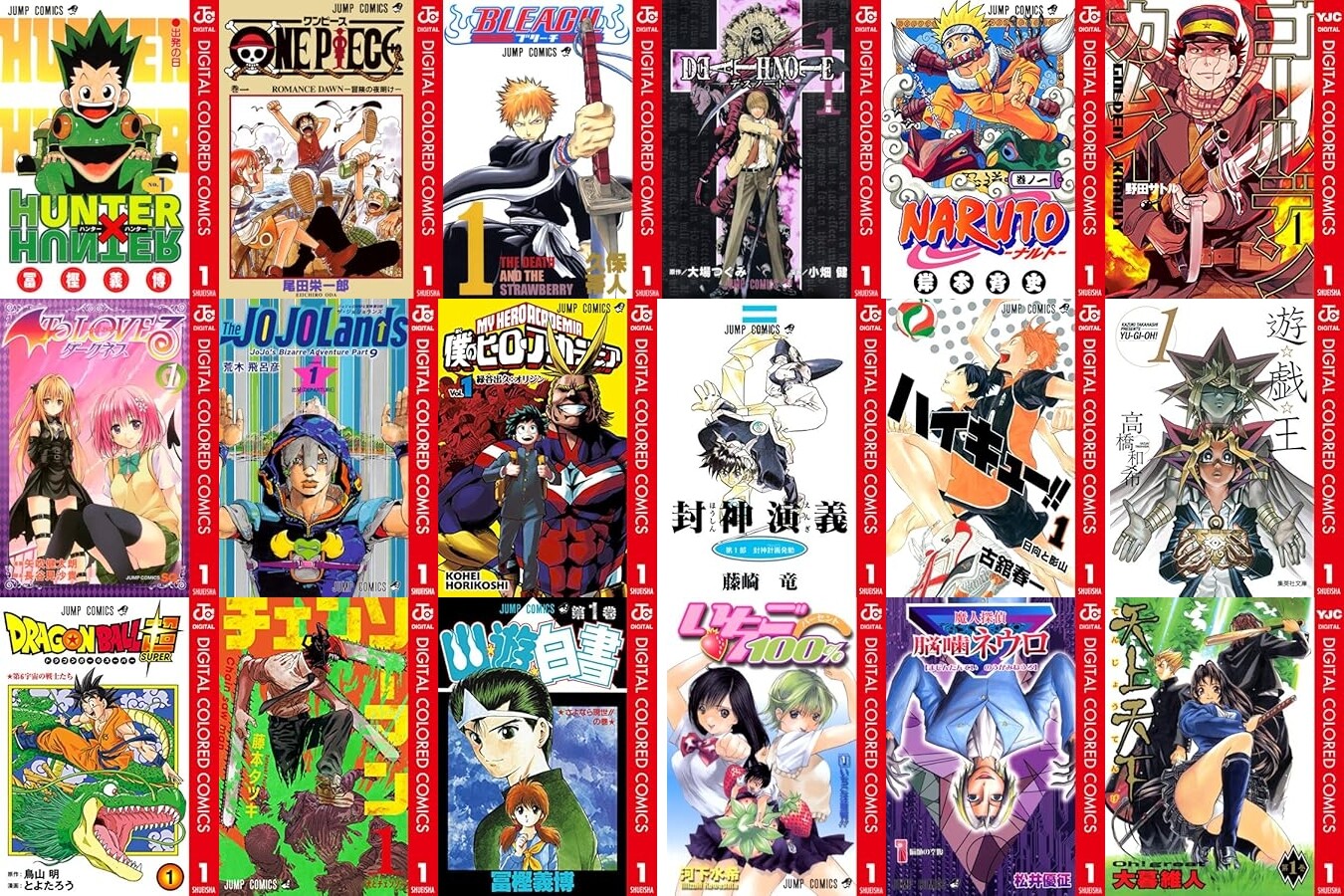 「HUNTER×HUNTER」「ONE PIECE」「BLEACH」「DEATH NOTE」「バクマン。」「To LOVEる―とらぶる―ダークネス」「僕のヒーローアカデミア」「NARUTO」「ハイキュー!!」「ゴールデンカムイ」「封神演義」「ドラゴンボール超」「チェンソーマン」「遊☆戯☆王」「幽★遊★白書」「