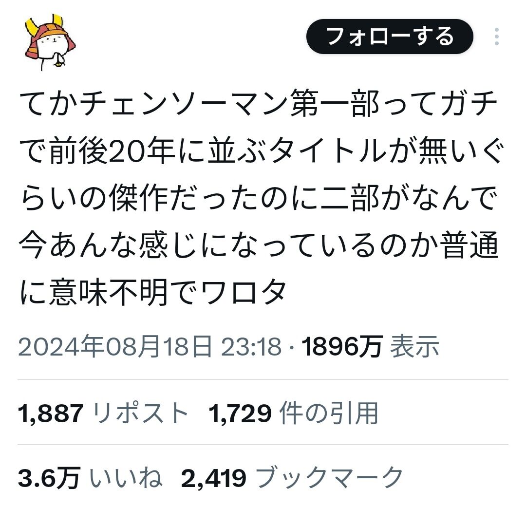 【悲報】「チェンソーマン二部」がなんで今あんな感じになってるのか普通に意味不明でワロタwwww 2024/10/27 最強ジャンプ放送局 " " 1: 2024/10/26(土) 2: 2024/10/26(土) Twitterで言われるレベルとかやばいね 3: 2024/10/26(土) 実際売り上げ落ちてるしな 4: 2024/10/26(土) ずーっとB級映画見てる気分な第二部 続きを読む Source: 最強ジャンプ放送局