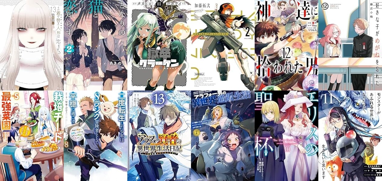 「その着せ替え人形は恋をする」「となりの猫と恋知らず」「獄卒クラーケン」「メカニカル バディ ユニバース」「神達に拾われた男」「好きな子がめがねを忘れた」「栽培チートで最強菜園」「二度転生した少年はSランク冒険者として平穏に過ごす」「寝取られ漫画のクズ男に転生したはずがヒロインが寄ってくる件」「アラフォー賢者の異世界生活日記」「転生したら最強種たちが住まう島でした。この島でスローライフを楽しみます」「ひねくれ騎士とふわふわ姫様」「先生! 僕たちが世界を滅ぼします。」「アラフォー男の異世界通販生活」「ゆるふわ農家の文字化けスキル」「エリスの聖杯」などなど。