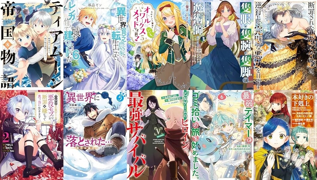 「ティアムーン帝国物語」「異世界の貧乏農家に転生したので、レンガを作って城を建てることにしました」「ヒロイン?聖女?いいえ、オールワークスメイドです(誇)!」「隻眼・隻腕・隻脚の魔術師」「断罪された悪役令嬢は、逆行して完璧な悪女を目指す」「やり込んだ乙女ゲームの悪役モブですが、断罪は嫌なので真っ当に生きます」「僕は今すぐ前世の記憶を捨てたい。」「異世界に落とされた…浄化は基本!」「乙女ゲームのヒロインで最強サバイバル」「最弱テイマーはゴミ拾いの旅を始めました。」「本好きの下剋上シリーズ」「穏やか貴族の休暇のすすめ。」「今日も絵に描いた餅が美味」「転生したら皇帝でした」「など対象です。