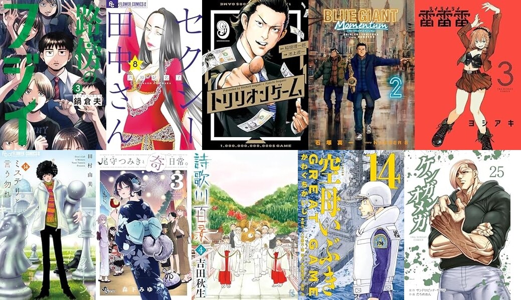 話題の真ヒーローを描く「路傍のフジイ」、ドラマ化がされた「トリリオンゲーム」、ほか「セクシー田中さん」「BLUE GIANT MOMENTUM」「雷雷雷」「ミステリと言う勿れ」「尾守つみきと奇日常。」「詩歌川百景」「空母いぶきGREAT GAME」「ケンガンオメガ」「もう興味がないと離婚された令嬢の意外と楽しい新生活」「名探偵コナン 犯人の犯沢さん」「アジール」などなど。
