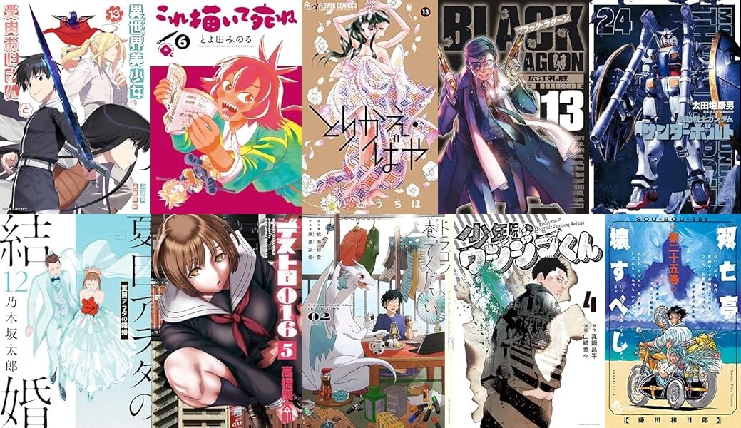 「異世界美少女受肉おじさんと」「これ描いて死ね」「とりかえ・ばや」「ブラック・ラグーン」「機動戦士ガンダム サンダーボルト」「夏目アラタの結婚」「デストロ016」「ドラゴン養ってください」「少年院ウシジマくん」「双亡亭壊すべし」「フールナイト」「結婚するって、本当ですか」「銀の匙 Silver Spoon」などなど。