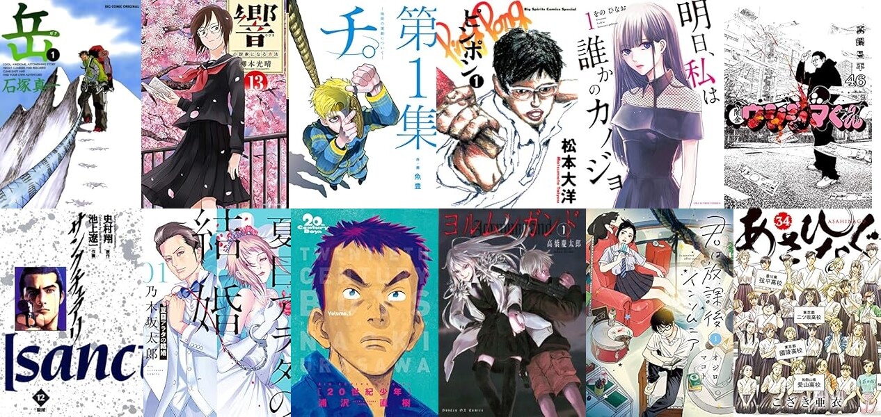 「岳」「響~小説家になる方法~」「チ。―地球の運動について―」「ピンポン」「明日、私は誰かのカノジ」「闇金ウシジマくん」「サンクチュアリ」「夏目アラタの結婚」「20世紀少年 完全版 デジタル Ver.」「ヨルムンガンド」「君は放課後インソムニア」「王様達のヴァイキング」「結婚するって、本当ですか」「七夕の国」「あさひなぐ」などなど。