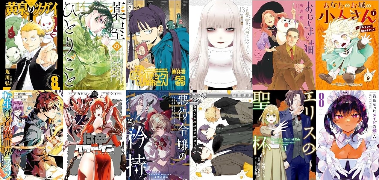 「黄泉のツガイ」「薬屋のひとりごと」「プラスチック姉さん」「その着せ替え人形は恋をする」「おじさまと猫」「あなたのお城の小人さん」「転生賢者の異世界ライフ」「獄卒クラーケン」「悪役令嬢の矜持」「合コンに行ったら女がいなかった話」「エリスの聖杯」「最近雇ったメイドが怪しい」「事情を知らない転校生がグイグイくる。」「神達に拾われた男」「ブルーアーカイブ ゲーム開発部だいぼうけん!」「魔法科高校の劣等生 一条将輝転校編」