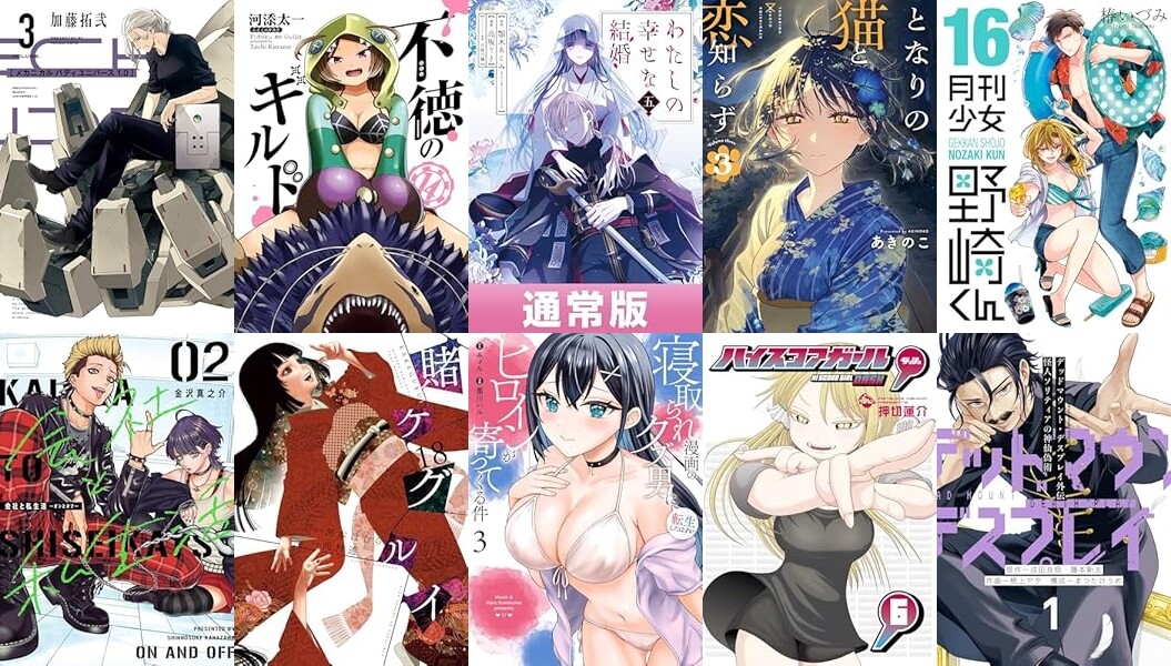 「メカニカル バディ ユニバース 1.0」「不徳のギルド」「わたしの幸せな結婚」「となりの猫と恋知らず」「月刊少女野崎くん」「会社と私生活-オンとオフ-」「賭ケグルイ」「寝取られ漫画のクズ男に転生したはずがヒロインが寄ってくる件」「ハイスコアガール DASH」「デッドマウント・デスプレイ外伝 怪人ソリティアの神仙偽術」「配達先のお姉さんが怖すぎる」「ゴブリンスレイヤー」などなど。