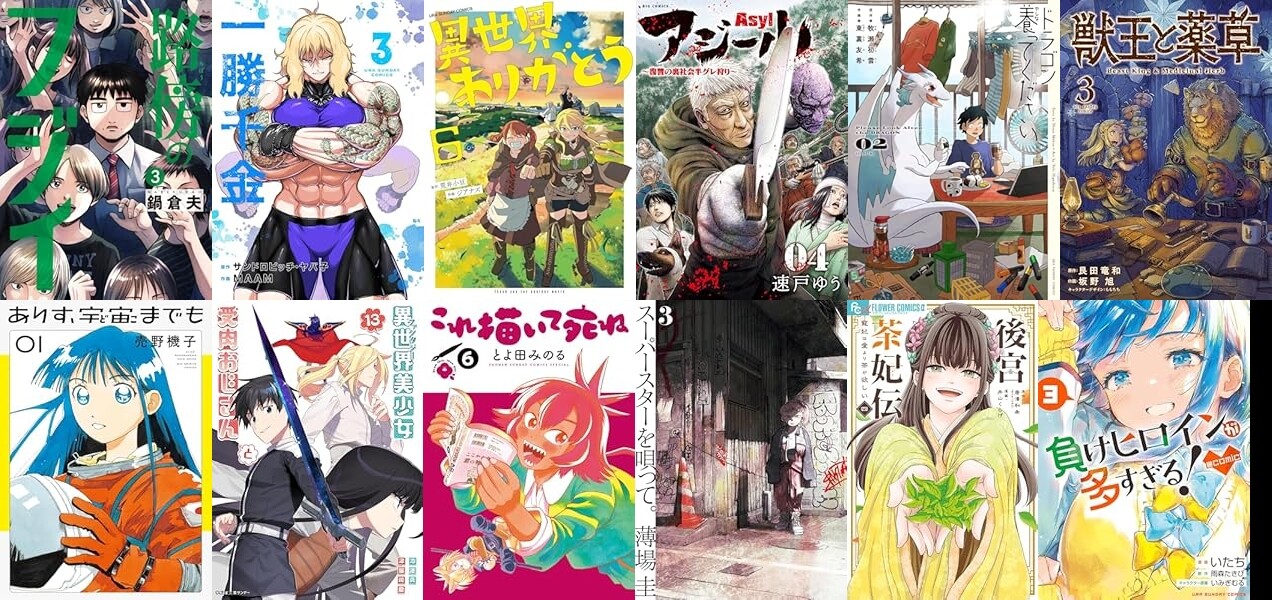 「路傍のフジイ」「一勝千金」「異世界ありがとう」「アジール Asyl ~復讐の裏社会半グレ狩り~」「ドラゴン養ってください」「獣王と薬草」「ありす、宇宙までも」「異世界美少女受肉おじさんと」「これ描いて死ね」「スーパースターを唄って。」「後宮茶妃伝」「負けヒロインが多すぎる!@comic」「死にかけ悪役令嬢の失踪」「【新装版】今どきの若いモンは」「小さい僕の春」「煩悩☆西遊記」「任侠転生」「ダンベル何キロ持てる?」「ふしぎ遊戯 白虎仙記」などなど。
