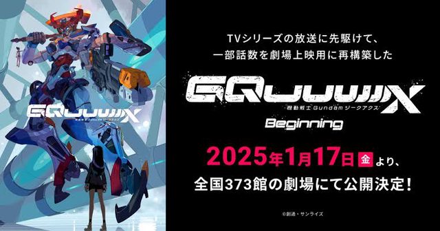 スタジオカラー×サンライズの初タッグでお届けする、ガンダムシリーズ最新作『機動戦士Gundam GQuuuuuuXジークアクス』。TVシリーズの放送に先駆け、一部話数を劇場上映用に再構築した劇場先行版『機動戦士Gundam GQuuuuuuX(ジークアクス) -Beginning-』が、2025年1月17日(金)より、IMAX®52館を含めて、合計426館の劇場にて上映。
