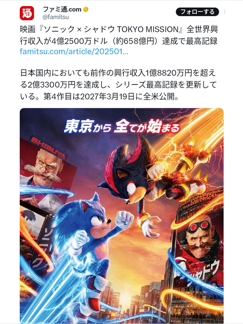 映画ソニック3の全世界興行収入www 2025/1/28 ねいろ速報さん " " 名前:ねいろ速報 外人ソニック好きすぎ! 名前:ねいろ速報 1 国内でも2億あったんだな 名前:ねいろ速報 15 >>1 1/5忍たまか…… 続きを読む Source: ねいろ速報さん