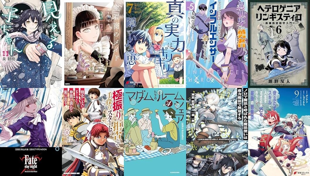 「見える子ちゃん」「宝石商のメイド」「真の実力はギリギリまで隠していようと思う」「異世界帰りの勇者は、ダンジョンが出現した現実世界で、インフルエンサーになって金を稼ぎます!」「ヘテロゲニア リンギスティコ」「Fate/stay night[Unlimited Blade Works]」「極振り拒否して手探りスタート!」「マダムたちのルームシェア」「ノロマ魔法と呼ばれた魔法使いは重力魔法で無双する」「役立たずスキルに人生を注ぎ込み25年、今さら最強の冒険譚」「野人転生」「異世界の沙汰は社畜次第」などなど。