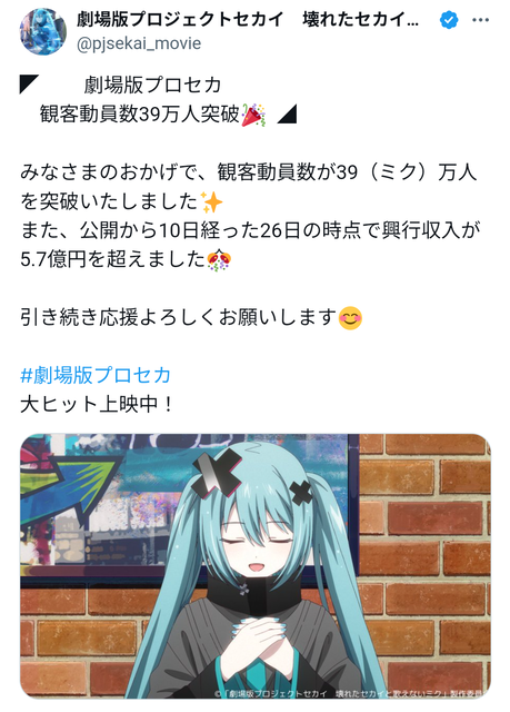 映画プロセカ、興行収入5億を超える 2025/1/29 ねいろ速報さん " " 名前:ねいろ速報 話題作と被っちゃったけどミクさんも頑張ってます 名前:ねいろ速報 1 他のアニメ映画と比べるとどの辺り? 名前:ねいろ速報 670 >>1 ガンダムの配給権を手に入れたぞ!とりあえず景気付けに420館で上映! 続きを読む Source: ねいろ速報さん