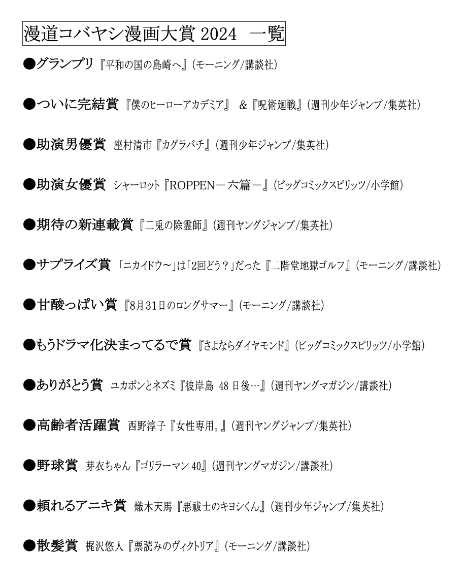 【速報】ケンコバが独断で選ぶ「漫コバ漫画大賞2024」、各賞が発表される 2025/2/13 超マンガ速報 " " 1: 2025/02/13(木) 10:30:14.46 ID:X/vcZxhm0 ↓ 2: 2025/02/13(木) 10:30:32.51 ID:X/vcZxhm0 https://pbs.twimg.com/media/GjoV6b2bgAAxf4n.png おめでとうございます 続きを読む Source: 超マンガ速報