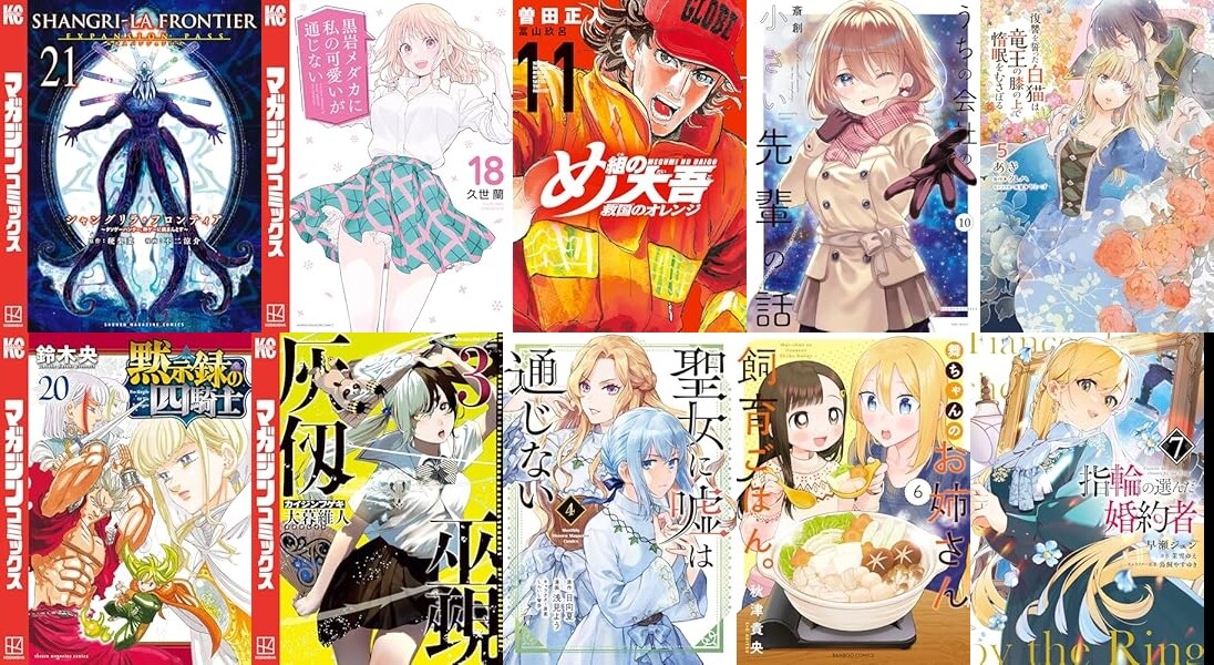 講談社「シャングリラ・フロンティア(21)」「黒岩メダカに私の可愛いが通じない(18)」「黙示録の四騎士(20)」「め組の大吾 救国のオレンジ(11)」「灰仭巫覡(3)」「聖女に嘘は通じない(4)」「よわよわ先生(11)」「陸奥圓明流異界伝 修羅の紋 ムツさんはチョー強い?!(13)」など、竹書房「うちの会社の小さい先輩の話(10)」「舞ちゃんのお姉さん飼育ごはん。 (6)」「どうしたら幼馴染の彼女になれますか!? (5)」など、KADOKAWA「復讐を誓った白猫は竜王の膝の上で惰眠をむさぼる 5」「指輪の選んだ婚約者 7」「小動物系令嬢は氷の王子に溺愛される (6)」「宮廷魔術師の婚約者 3」など発売です。