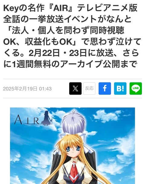 AIR泣きした? 2025/2/20 ねいろ速報さん " " 名前:ねいろ速報 名前:ねいろ速報 1 世代が違うのもあってか個人的にはピンとこなかったんだけど ヘブバン人気もあるし話題になったりするんかしらね 名前:ねいろ速報 2 何故冬に? 続きを読む Source: ねいろ速報さん