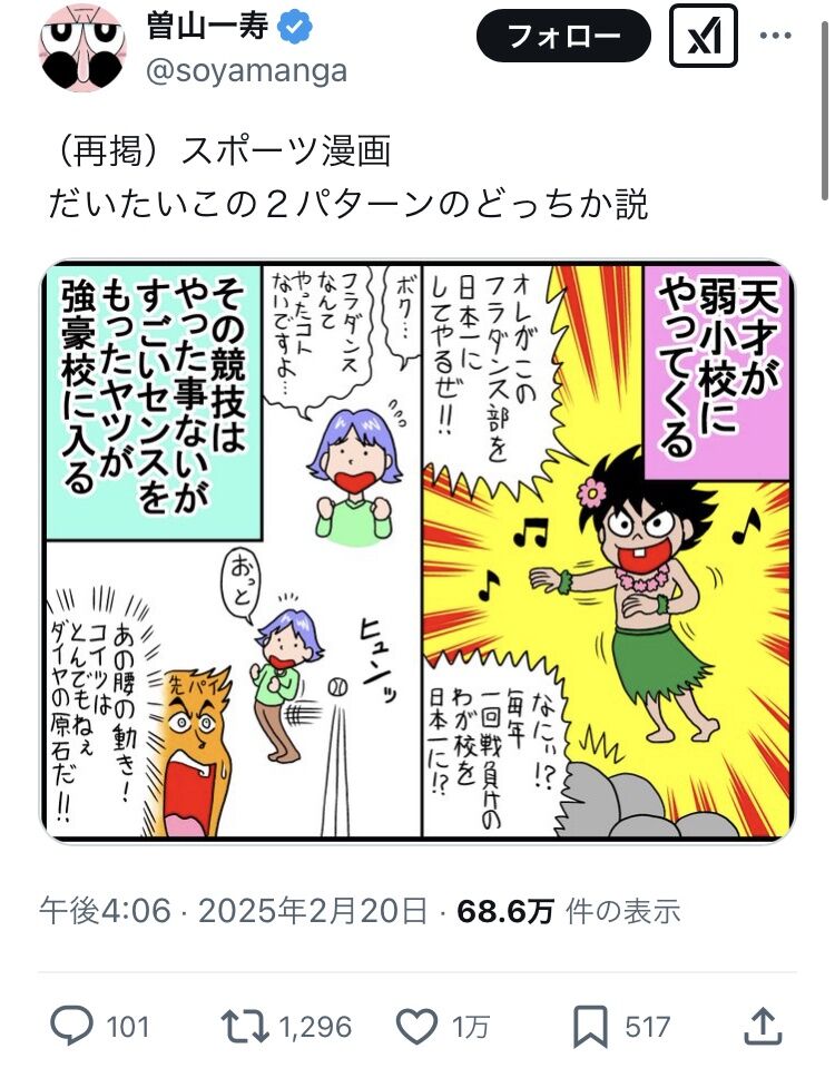 漫画家「スポーツ漫画って大体2パターンだよな?」←セヤッッッッwwww 2025/2/22 ジャンプ速報 " " 1: 風吹けば名無し 2025/02/21(金) 11:58:43.90 ID:dWIuZ+pJ0 草 続きを読む Source: ジャンプ速報