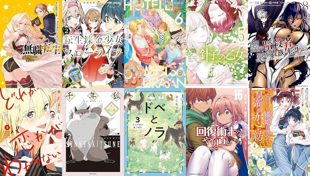 「無職転生」「転生錬金少女のスローライフ」「ホテル・メッツァペウラへようこそ」「針子の乙女」「世界最高の暗殺者、異世界貴族に転生する」「どれが恋かがわからない」「千年狐」「ドベとノラ」「みなと商事コインランドリー」「獣上司に実は認められていた話」「アイドル辞めるけど結婚してくれますか!?」「アオイ君の猥談がたまらない!!」「盲目の織姫は後宮で皇帝との恋を紡ぐ」「回復術士のやり直し」などなど。
