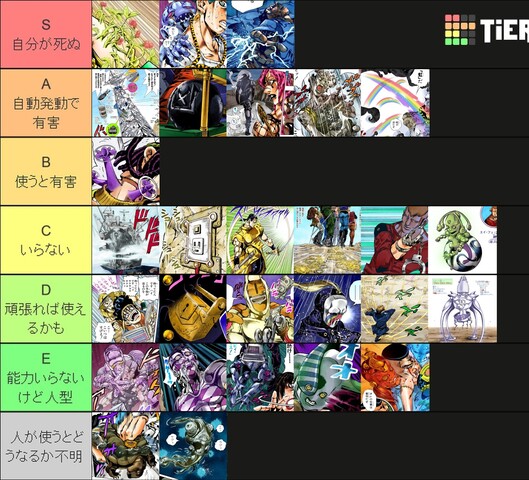 【ジョジョ】いらないスタンドTier 2025/2/27 ねいろ速報さん " " 名前:ねいろ速報 暇だからいらないスタンドTierを作ってた 名前:ねいろ速報 1 画質悪すぎてなんなのかわかんねぇのがある! 名前:ねいろ速報 4 >>1 すまない… Eの一番左はダービー兄のです 続きを読む Source: ねいろ速報さん