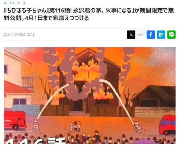 ちびまる子公式「永沢家火事の回YouTubeで配信」 2025/3/3 ねいろ速報さん " " 1: ねいろ速報 人の心ナインか? 3: ねいろ速報 人の心ないのは「永沢くんを励ます回」とか開いた奴やろ 4: ねいろ速報 時期もおんなじなんやな 続きを読む Source: ねいろ速報さん