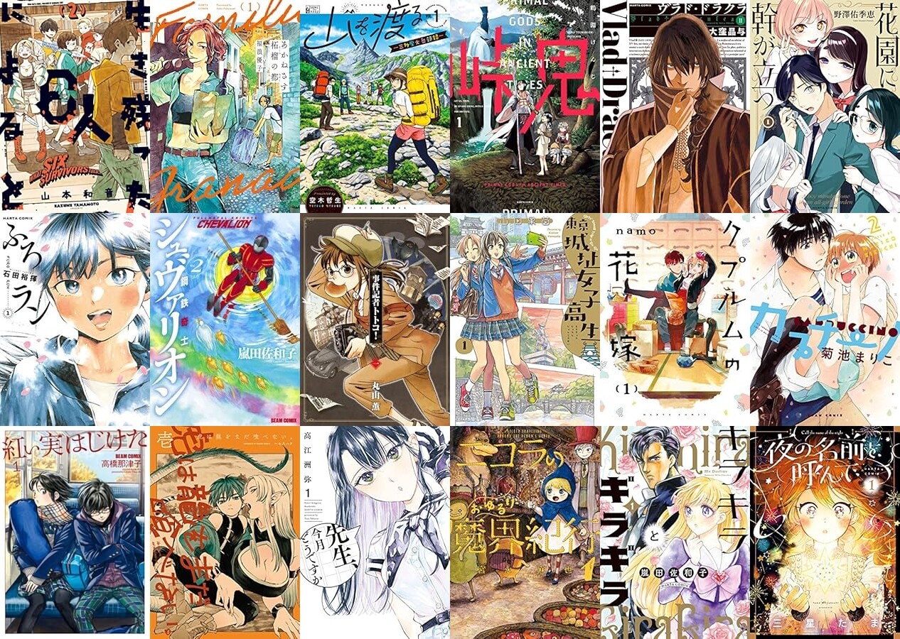 「生き残った6人によると」「あかねさす柘榴の都」「山を渡る」「峠鬼」「ヴラド・ドラクラ」「花園に幹が立つ」「ふろラン」「鋼鉄奇士シュヴァリオン」「事件記者トトコ!」「東京城址女子高生」「クプルムの花嫁」「カプチーノ」「紅い実はじけた」「虎は龍をまだ喰べない。」「先生、今月どうですか」「ニコラのおゆるり魔界紀行」などなど。