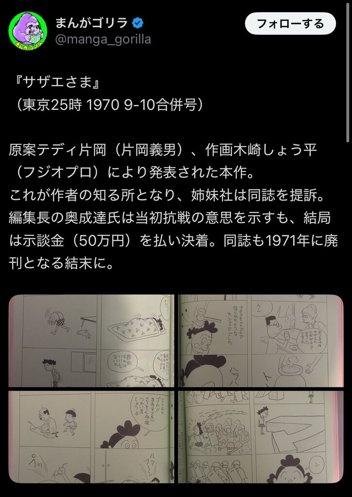 【炎上】昭和に発刊された「サザエさん」のパロディ漫画、ヤバ過ぎるwwwww 2025/3/11 ジャンプ速報 " " 1: 風吹けば名無し 2025/03/11(火) 17:33:00.771 ID:WD8wusu70 ダメに決まってんだろこんなん 続きを読む Source: ジャンプ速報