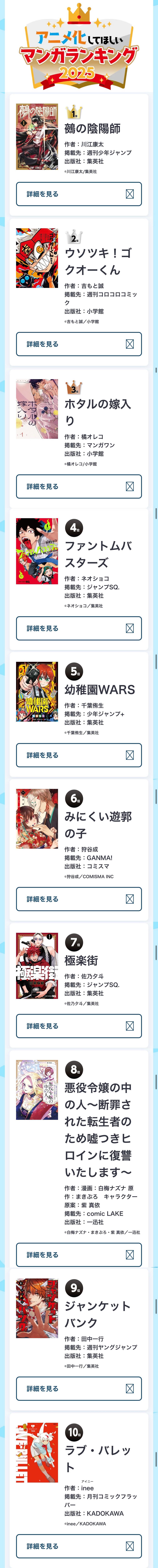 アニメ化してほしい漫画ランキング発表キタ━━(゚∀゚)━━!!www 2025/3/14 ジャンプ速報 " " 1: 風吹けば名無し 2025/03/13(木) 19:09:16.471 ID:/QS15Aca0 続きを読む Source: ジャンプ速報