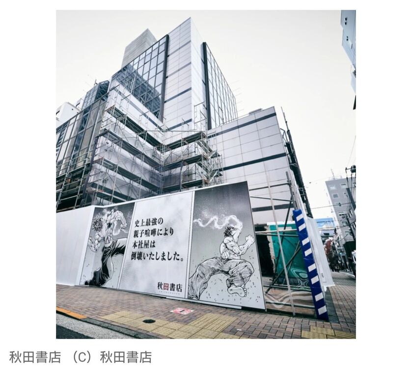 同ビルは建て替え工事中で、24日より工事現場の仮囲いが、人気漫画『刃牙』シリーズの主人公・範馬刃牙が最強の父・勇次郎に挑んだ名場面「史上最強の親子喧嘩」をテーマにした粋な演出が実施されて話題となっていた。