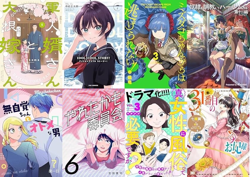 芳文社「軍人婿さんと大根嫁さん 5巻」「IDOL×IDOL STORY! 7巻」「ミズダコちゃんからは逃げられない! 3巻」など、ナンバーナイン「奴隷を調教してハーレム作る【連載版】 第十二編」「無自覚ちゃんとオトメな男【連載版】 7」など、電書バト「やれたかも委員会 6巻」など、新潮社「真・女性に風俗って必要ですか?3巻」、KADOKAWA「31番目のお妃様 7」「最強の鑑定士って誰のこと?11」「BLゲームの主人公の弟であることに気がつきました 4」など発売です。