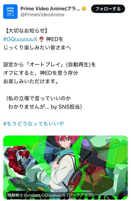 【ガンダムジークアクス】アマプラ何言ってんだ 2025/4/19 ねいろ速報さん " " 名前:ねいろ速報 何言ってんだお前ッ! 名前:ねいろ速報 1 偉いよこの担当… 名前:ねいろ速報 3 もうどうなってもいいやの精神 続きを読む Source: ねいろ速報さん