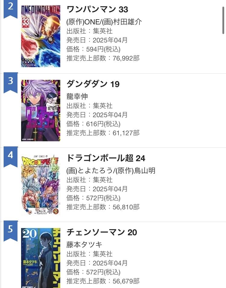 チェンソーマンの凋落っぷりがヤバすぎる…←言うほどヤバいか? 2025/5/5 ジャンプ速報 " " 1: 風吹けば名無し 2025/04/12(土) 15:24:40.36 ID:1mcGQfzdr ダンダダン19巻 2025年4月4日発売 チェンソーマン20巻 2025年4月4日発売 続きを読む Source: ジャンプ速報