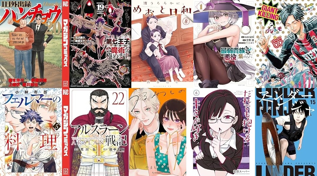 「1日外出録ハンチョウ」「転生したら第七王子だったので、気ままに魔術を極めます」「フェルマーの料理」「波うららかに、めおと日和」「最弱貴族に転生したので悪役たちを集めてみた」「アルスラーン戦記」「転生貴族、鑑定スキルで成り上がる」「うるわしの宵の月」「だれでも抱けるキミが好き」「七つ屋志のぶの宝石匣」「僕だけが知ってるんだぜ」「アンダーニンジャ」「カッコウの許嫁」「GIANT KILLING」「不滅のあなたへ」などなど。