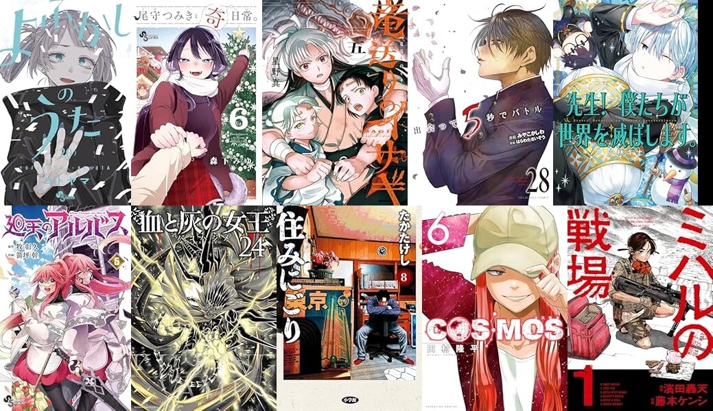 7月21日、対象作品が増えたので追加でまとめてみました。「よふかしのうた」は全20巻対象、そして「廻天のアルバス」「尾守つみきと奇日常。」「竜送りのイサギ」「出会って5秒でバトル」「裏バイト:逃亡禁止」「火の神さまの掃除人ですが、いつの間にか花嫁として溺愛されています」「血と灰の女王」「住みにごり」「タタリ」「氷結令嬢さまをフォローしたら、メチャメチャ溺愛されてしまった件」「あと6日で滅びる崖っぷち国家のハーレムに召喚されてしまった」「ホタルの嫁入り」「COSMOS」「舞妓さんちのまかないさん」