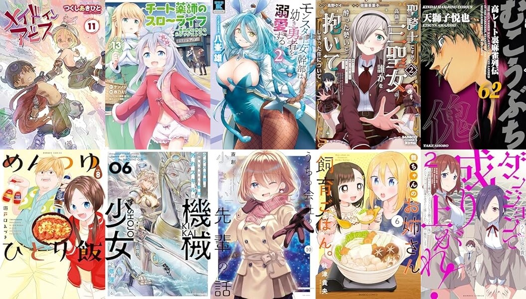 「メイドインアビス」1~3巻が各11円、4~11巻が約70%OFF!ほか「チート薬師のスローライフ」「モンスター女幹部は幼き勇者を溺愛する」「聖騎士ですが、高嶺の三聖女の誰かを酔った勢いで抱いてしまった件について」「むこうぶち 高レート裏麻雀列伝」「めんつゆひとり飯」「クラス召喚に巻き込まれた教師、外れスキルで機械少女を修理する」「うちの会社の小さい先輩の話」「舞ちゃんのお姉さん飼育ごはん。」「ダンジョンで成り上がれ!」「魔剣師の魔剣による魔剣のためのハーレムライフ 」などセールです。