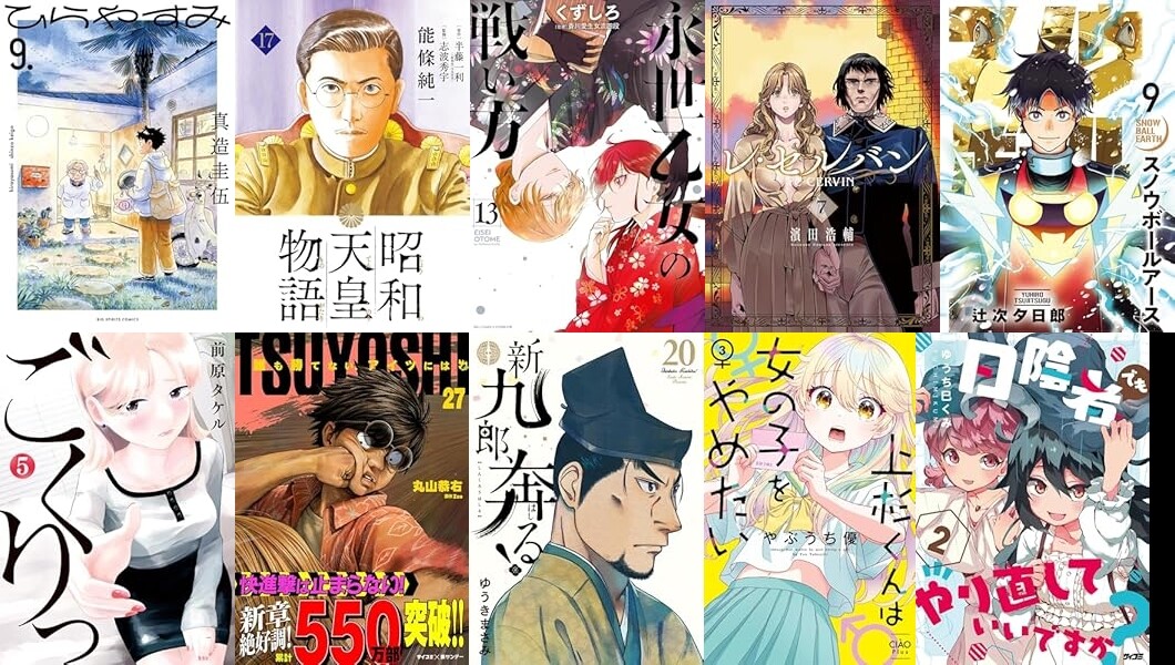 「ひらやすみ」「昭和天皇物語」「永世乙女の戦い方」「レ・セルバン」「スノウボールアース」「ごくりっ」「TSUYOSHI 誰も勝てない、アイツには」「新九郎、奔る!」「上杉くんは女の子をやめたい」「日陰者でもやり直していいですか?」「パーフェクトグリッター」