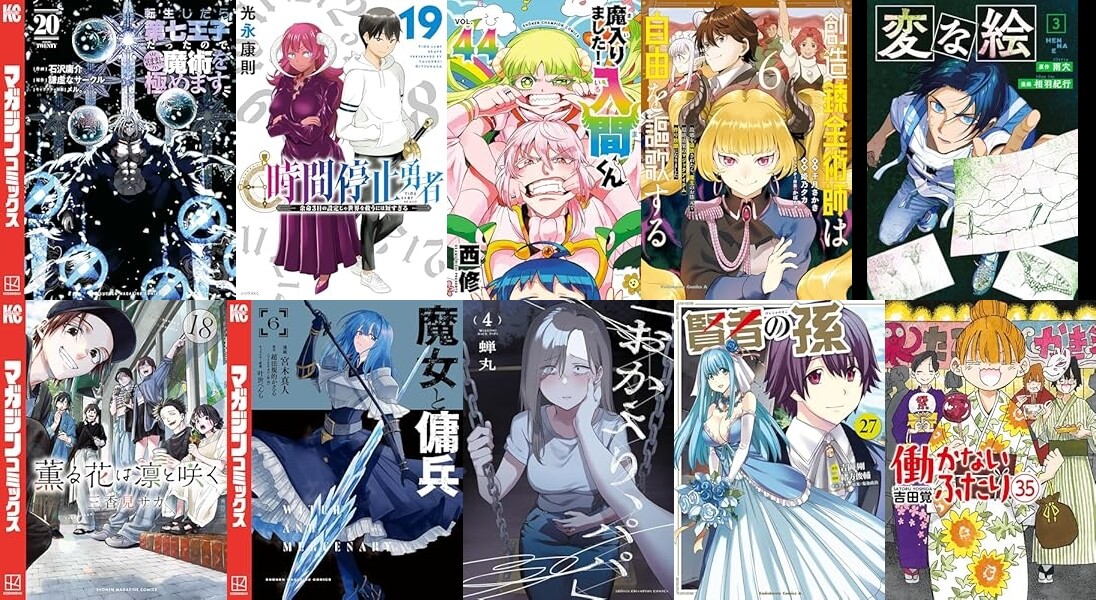 秋田書店「魔入りました!入間くん 44」「おかえり、パパ 4」「漫画 ゆうえんち -バキ外伝- 8」「BREAK BACK 22」「きみは四葉のクローバー 5」「学園アイドルマスター GOLD RUSH 3」「SHY 30」など、KADOKAWA「創造錬金術師は自由を謳歌する 故郷を追放されたら、魔王のお膝元で超絶効果のマジックアイテム作り放題になりました (6)」「賢者の孫(27)」「推しにささげるダンジョングルメ 2」「脱稿するまでオチません(4)」「お見合いしたくなかったので、無理難題な条件をつけたら同級生が来た件について (3)」「魔法使いの犯罪捜査 (5)」など、