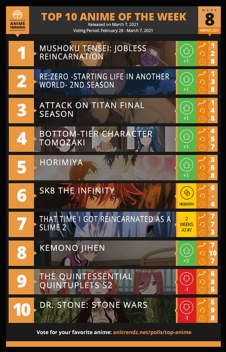 海外アニメサイト・AnimeTrendingにて、2021年冬アニメ放送8週目のランキングが発表されています。