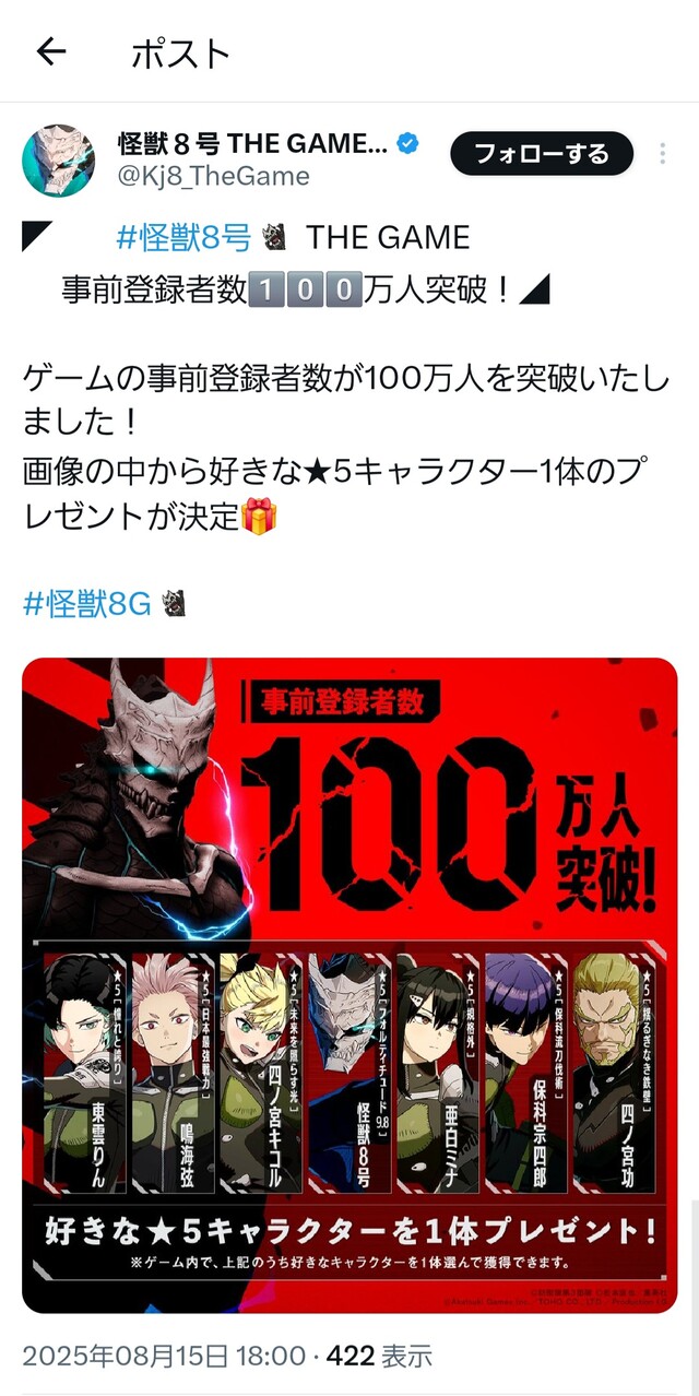 怪獣8号ソシャゲが事前登録者1000000人突破 2025/8/19 ねいろ速報さん " " 名前:ねいろ速報 したけど 名前:ねいろ速報 1 うおおお 名前:ねいろ速報 4 50万人から一気に増えてて凄い 続きを読む Source: ねいろ速報さん