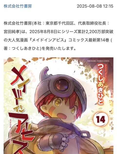 メイドインアビス、2200万部突破! 2025/8/20 ねいろ速報さん " " 名前:ねいろ速報 なんかいつの間にかすげー売れてた ! 名前:ねいろ速報 1 電子書籍が超安いセール頻繁にやっててすごく買いやすい 名前:ねいろ速報 3 本当にすげー売れてる 続きを読む Source: ねいろ速報さん