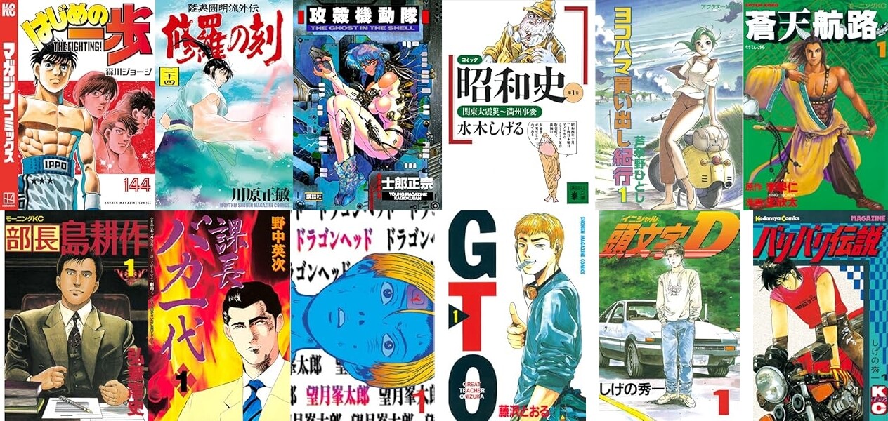 「はじめの一歩」は最新巻含め全144巻対象、「修羅の刻」も最新巻含め全24巻対象。ほか「攻殻機動隊」「ヨコハマ買い出し紀行」「蒼天航路」「島耕作シリーズ」「GTO」「柔道部物語」「頭文字D」「バリバリ伝説」「湾岸MIDNIGHT」「行け!稲中卓球部」など20作品ほどをまとめました。