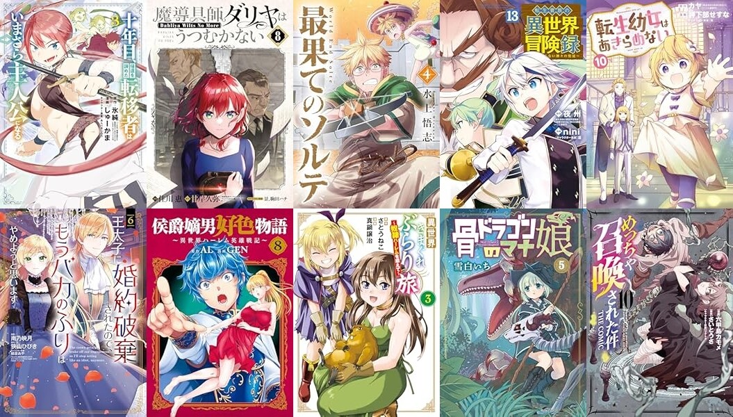「十年目、帰還を諦めた転移者はいまさら主人公になる」「魔導具師ダリヤはうつむかない」「最果てのソルテ」「転生貴族の異世界冒険録」「王太子に婚約破棄されたので、もうバカのふりはやめようと思います」「侯爵嫡男好色物語」「異世界きまぐれぶらり旅」「骨ドラゴンのマナ娘」「転生幼女はあきらめない」「めっちゃ召喚された件」「裏切られたので、王妃付き侍女にジョブチェンジ!」「ロメリア戦記」「ニャイト・オブ・ザ・リビングキャット」