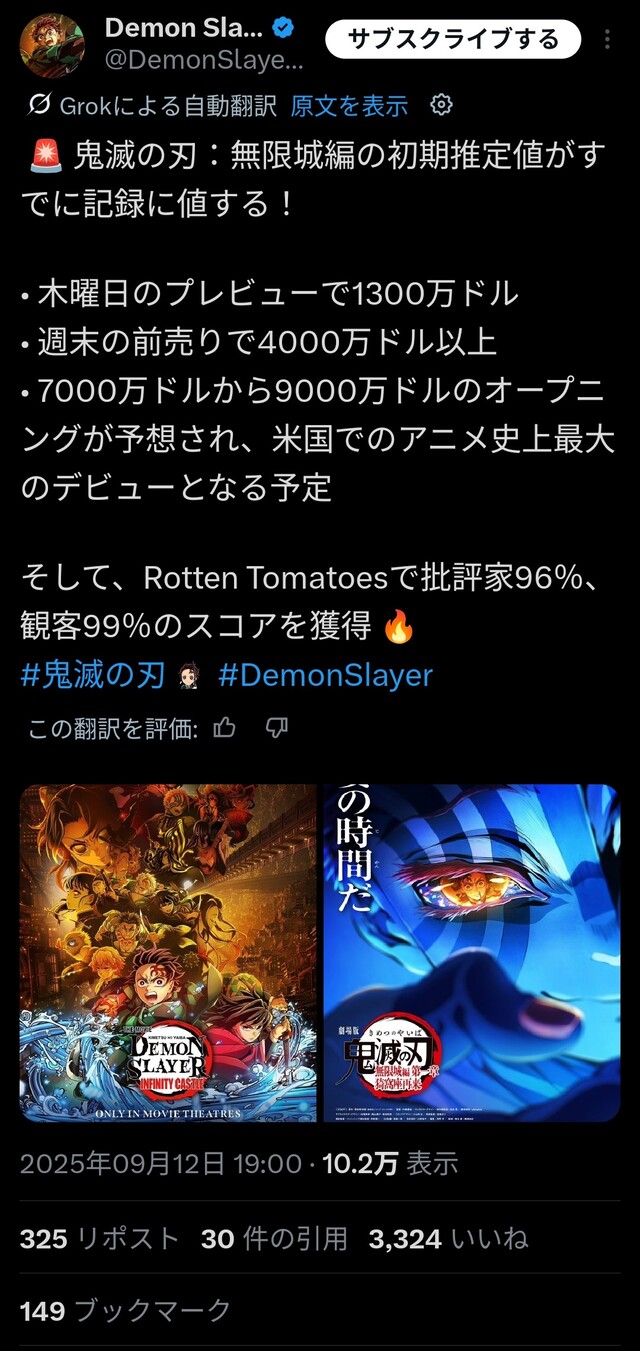 鬼滅全米興収初週100億超えらしい 2025/9/14 ねいろ速報さん " " 名前:ねいろ速報 何が起こってるんだ… 名前:ねいろ速報 5 ミュウツーを初週で超えるとかバグってんな… 名前:ねいろ速報 12 全米って規模考えたらそこまででもなくない? 続きを読む Source: ねいろ速報さん