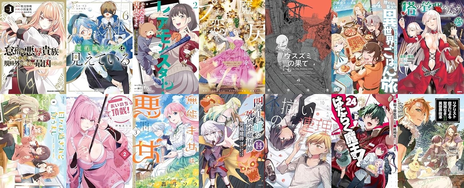 「怠惰な悪辱貴族に転生した俺、シナリオをぶっ壊したら規格外の魔力で最凶になった」「魔術師クノンは見えている」「レアモンスター?それ、ただの害虫ですよ」「死に戻りの魔法学校生活を、元恋人とプロローグから」「ウスズミの果て」「捨てられ聖女の異世界ごはん旅 隠れスキルでキャンピングカーを召喚しました」「塔の管理をしてみよう」「日々は過ぎれど飯うまし」「おいのち頂戴!」「無能才女は悪女になりたい」「四度目は嫌な死属性魔術師」などなど。
