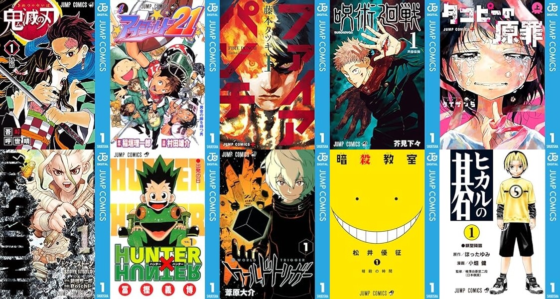 映画がまたまた大ヒット「鬼滅の刃」、アメフト代表的マンガ「アイシールド21」、チェンソーマンの原点がここに「ファイアパンチ」、2025年アニメ話題作「タコピーの原罪」、そして「呪術廻戦」「Dr.STONE」「HUNTER×HUNTER」「幽★遊★白書」「レベルE」「ワールドトリガー」「暗殺教室」「魔人探偵脳噛ネウロ」「ヒカルの碁」「DEATH NOTE」「バクマン。」「斉木楠雄のΨ難」「DRAGON BALL」「めだかボックス」「テニスの王子様」などなど。