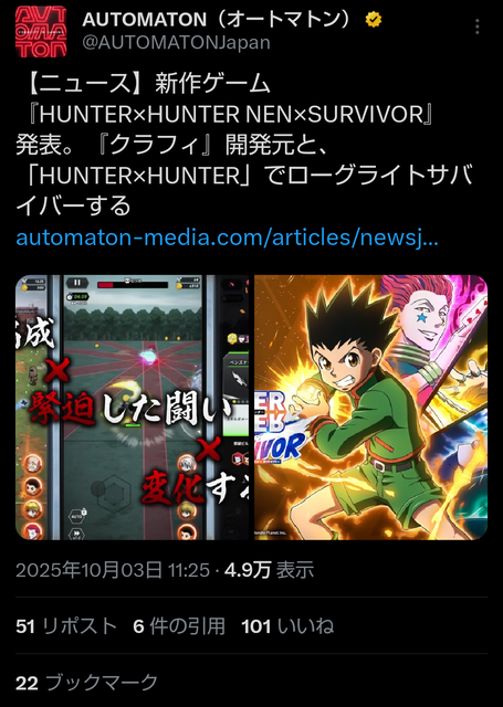 【ニュース】新作ゲーム『HUNTER×HUNTER NEN×SURVIVOR』発表。『クラフィ』開発元と、「HUNTER×HUNTER」でローグライトサバイバーするhttps://t.co/mdnLan4LbR pic.twitter.com/kLJb9zBD5c